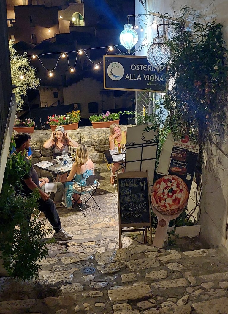 Vieta -"turistinėje" pagrindinėje gatvėje, bet dauguma jos lankytojų yra vietiniai italai, sveikinasi, glėbesčiuojasi su šeimininku, stovinčiu ant slenksčio. Gavome laisvą staliuką šešėlyje. Patiekalų pavadinimai - tik italų kalba, o vertimas į anglų kalbą labai minimalistinis. Aš nenorėjau makaronų, ir tiesiog išsirinkau mėsos patiekalą: polpetta al sugo (mėsos kukuliai su padažu). Ir kaina "krikščioniška" - 9,50 eur. Žmona valgė parmigiana di melanzane (kepti baklažanai su sūriu). Už tą pačią kainą. Tai tradiciniai vietiniai patiekalai. Neįmantrūs ir vaizdas šiaip sau, tačiau skonis buvo didelė staigmena! Net padažą su šalia patiekta Materos duona išdažėme iki paskutinio lašo. Aptarnavimas buvo pakankamai dėmesingas ir greitas.