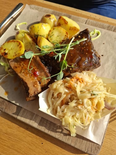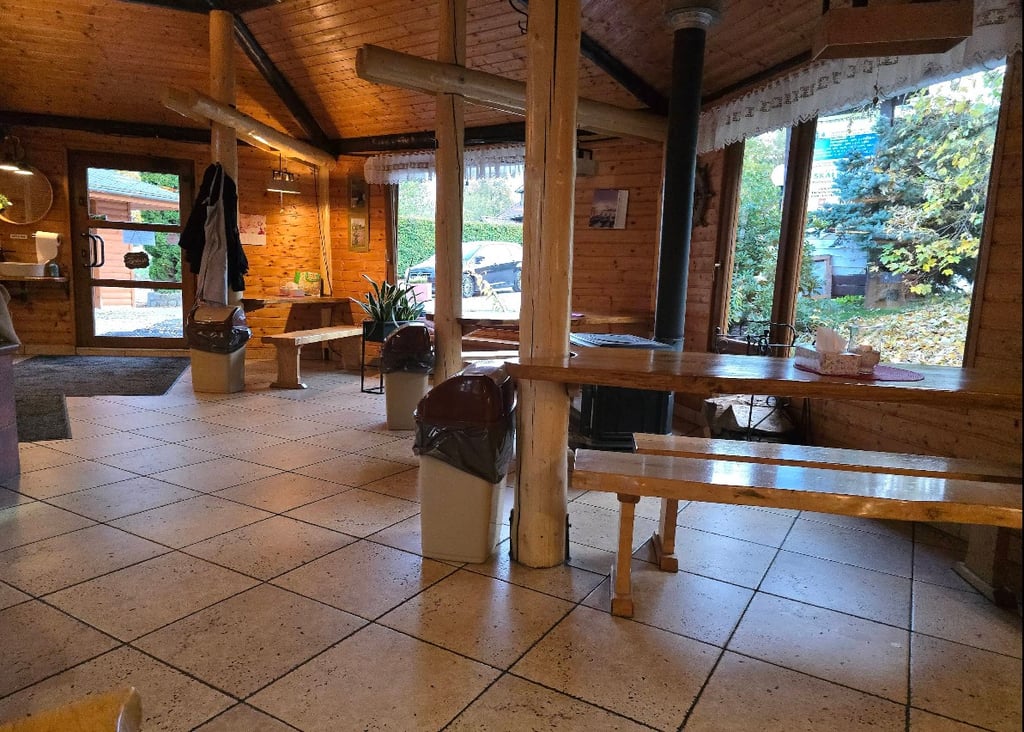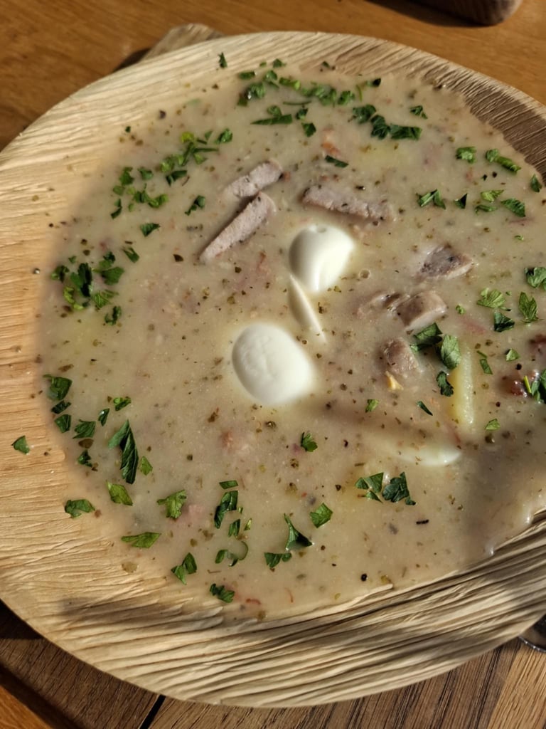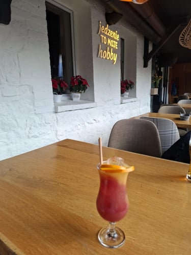 Mano akimis labai neblogas restoranas. Maistas irgi neblogas, skanu, bet nieko ypatingo. Dideli langai su vaizdu į Snežka kalną. Teoriškai skamba gerai, bet kai tai pietinė pusė ir į veidą plieskia saulė... Nežinau ar tai labai malonu. Žinoma yra vidinė salė, bet ji be langų. Nenoriu labai kabinėtis, nes mus aptarnavusi mergina buvo labai maloni. Supratusi, kad mes ne vietiniai iš karto paklausė kaip kalbėti - lenkiškai, ukrainietiškai, rusiškai? Pietūs (žiurekas, šonkauliai, gėrimai) kainavo 132 PLN (31,81 Eur.) Žiurekas buvo labai geras, kaip ir kokteilis . 😉