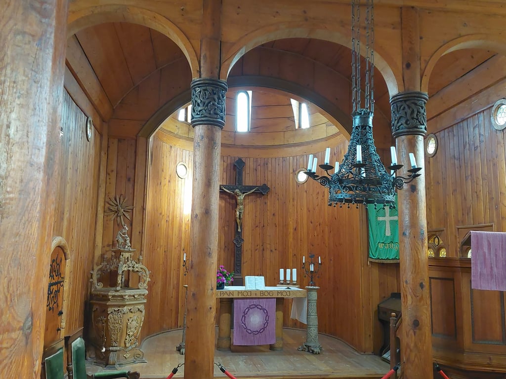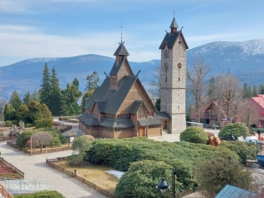 XII a. bažnyčia, pastatyta panašiai kaip vikingų ilgieji laivai, 1842 m. iš Norvegijos perkelta į šią vietą. Tikrai įspūdinga, bet tik iš išorės. Tikrai nerekomenduoju pirkti bilietų į vidų, o juo labiau fotografavimui. Bilietas 16 PLN/asm., už fotografavimą dar 5 PLN. Aš tą klaidą padariau, bet viduje nėra ką žiūrėti, o jo labiau fotografuoti. Galima tik melstis ir klausytis bažnyčios istorijos lenkų kalba. Aplankyti bažnyčią vertą, bet eiti į vidų už tokius pinigus – tikrai ne!