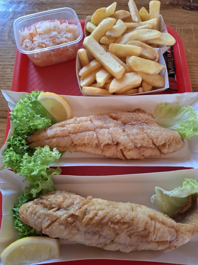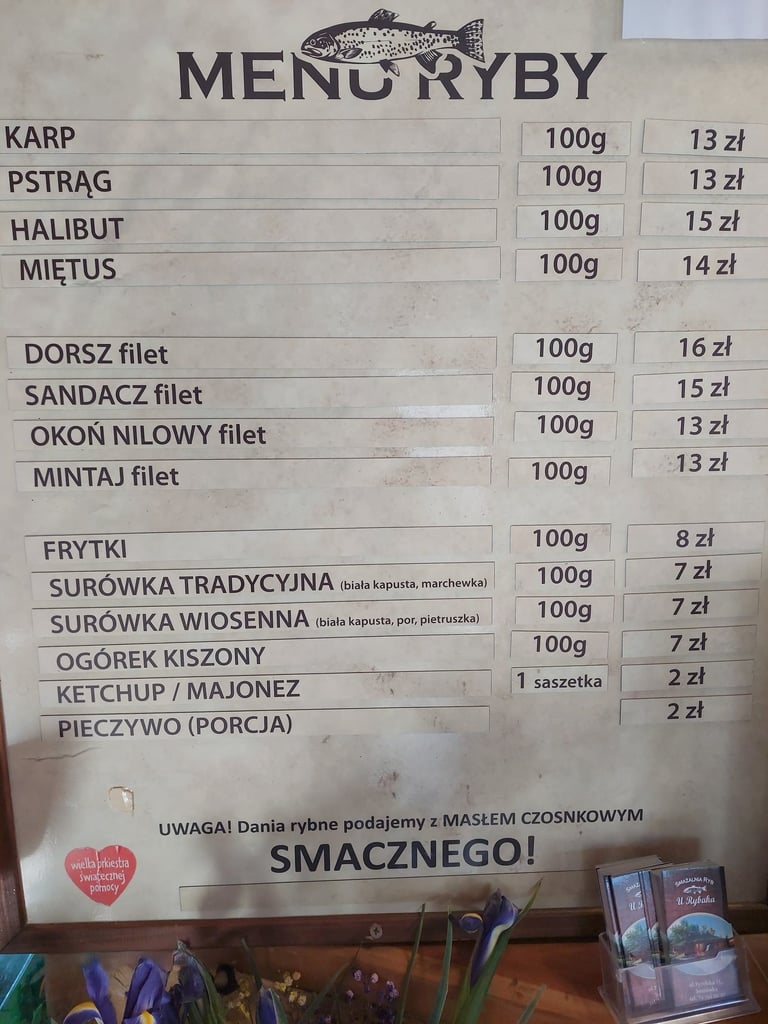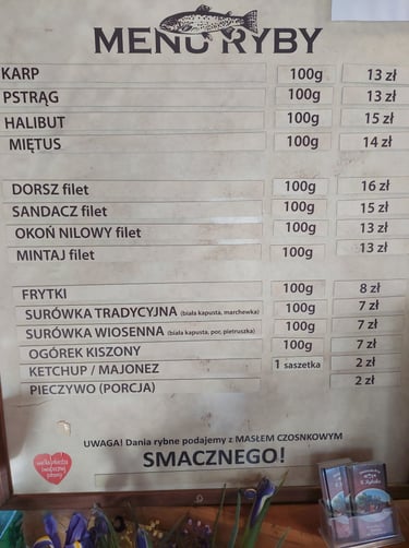 Užsisakius maistą, būtina atsiminti savo užsakymo numerį. Paruošus, užsakymo numeris pranešamas per garsiakalbį. Susimokėti reikia atsiimant užsakymą. Galima mokėti kortele. Gal pradžioje kiek painu, tačiau sterko file su bulvytėmis buvo labai skani, teisingai iškepta ir viena skaniausių kokią ragavau. Puiki vieta mėgstantiems žuvį. Už dvi porcijas su salotomis ir alumi sumokėjome 125 PLN (30,05 Eur.).Personalas draugiškas, bet kalbėjo tik lenkiškai. Šiokia tokia pagalba nemokantiems lenkų kalbos: Karp – karpis, halibut – otas, miętus – vėgėlė, pstrąg – upėtakis, dorsz – menkė, sandacz – sterkas, okoń – ešerys, surówka – salotos, ogórek kiszony – raugintas agurkas, pieczywo – duona.