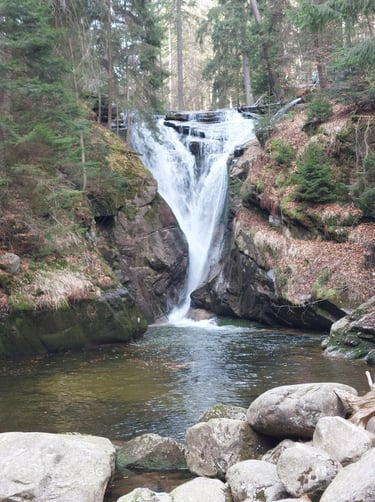 Kaskadiniai kriokliai, nuo Szklarska Poremba pasiekiami miškingais pėsčiųjų takais. Bet mes kur galima privažiuojame automobiliu. Parkinge šalia krioklio pilna prekybininkų kioskelių. Čia radome skaniausius sūrelius (lenk. Oscypek), tik neapsigaukite – jie gaminami ne vietoje, bet atvežami iš Zakopanės. Geriausi - iš avies ir ožkos pieno. Karvės pieno net neverta pirkti – man jie neskanūs. Atsiskaityti galima kortele. Jeigu parkinge nėra vietos, tai už 50 metrų kitoje kelio pusėje yra kitas, nemokamas parkingas.