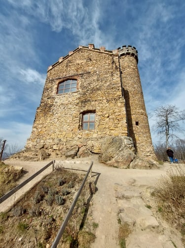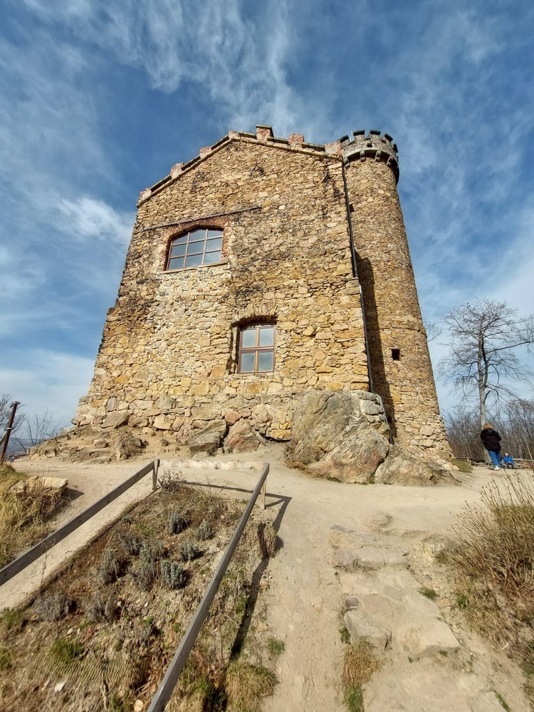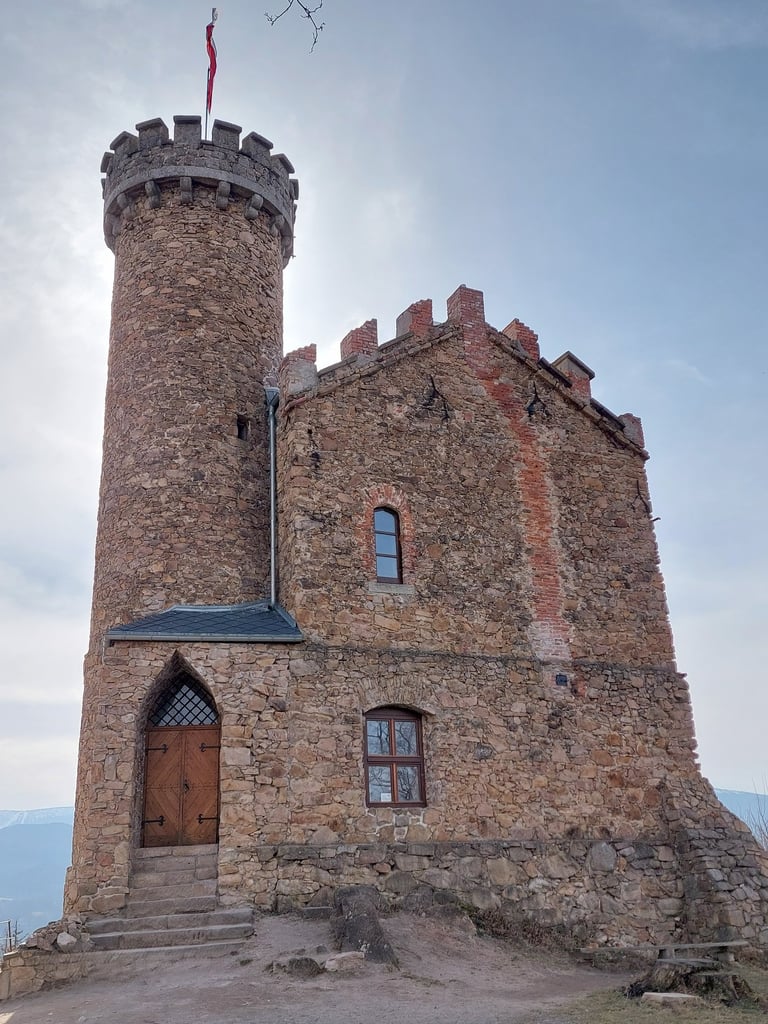 Pilis stovi ant miškų apsuptos kalvos, nuo kurios atsiveria nuostabus vaizdas į Karkonošų ir Śnieżka kalnus. Automobilį pasistatėme nedidelėje aikštelėje prieš ženklą, draudžiantį toliau važiuoti. Toliau keliu paėjome iki sankryžos, nuo kurios veda du takai į viršūnę. Į kairę - artimesnis, tiesiai - tolimesnis, bet lengvesnis. Juo pilis pasiekiama net ir vaikams. Ilgesnis - 1,2 km, 20 min, pakilimas 80 m. Kalnų batai nebūtini, bet pageidautini. Pilis, teisingiau, išlikęs jos bokštas, buvo uždarytas. Visgi vaizdai nuo kalno puikūs.