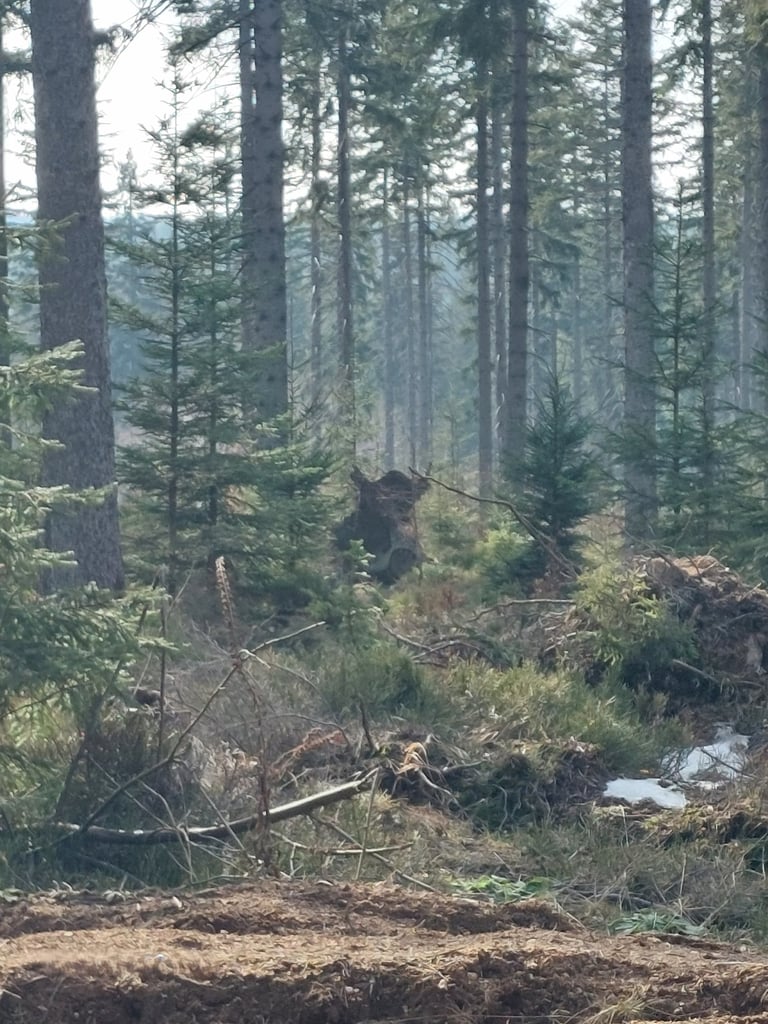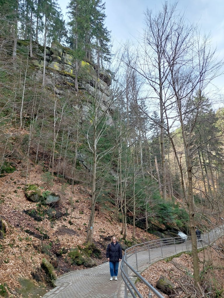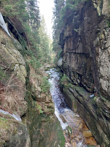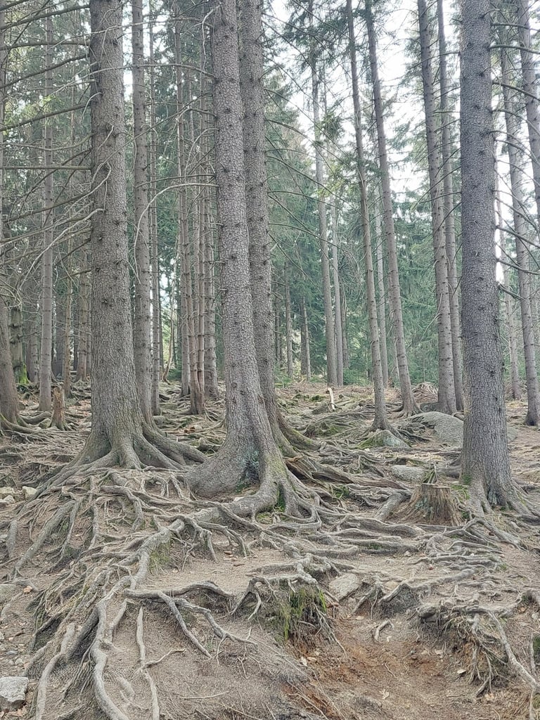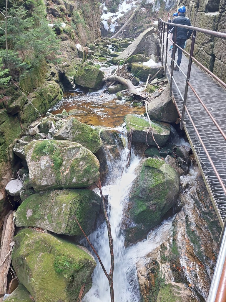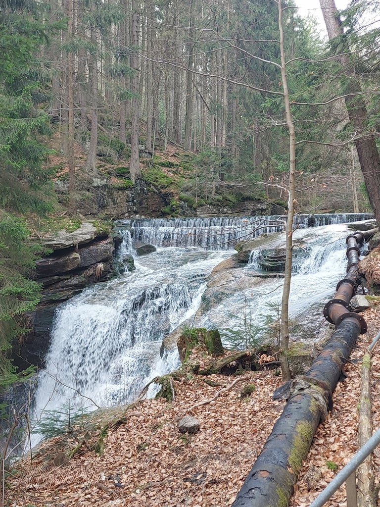 Tačiau keliu Nr.5 pavažiavus toliau, link Čekijos sienos, yra kitas parkingas. Jis arčiau kalno viršūnės. 1,2 km 22 min ir tik 91 m pakilimo. Parking do Wodospadu Kamieńczyka, be adreso tiesiog Szosa Czeska (Čekijos greitkelis). Waze jo nerodė. Tiesiog reikia važiuoti į kalną kol pamatysite parkingą. Kaina 20 PLN. Galima mokėti kortele. Nuo parkingo iki grįsto tako teko eiti miško keliu. Vietomis užlieto vandeniu nuo tirpstančio sniego, vietomis išvažinėto miškavežių. Tačiau tai lyguma. Kartu stebėjome mišką. Jis kitoks. Vietomis atrodo, kad kažkoks gyvūnas stebi, vietomis jis primena „Uždraustajį mišką“ iš „Hario Poterio“. Ar baisu? Ne, gal labiau smalsu. Na, įvertinkite tai patys.