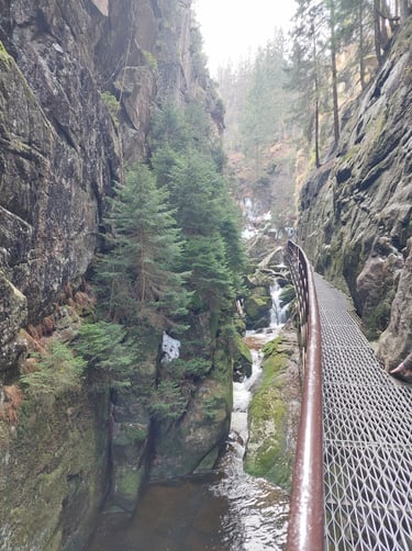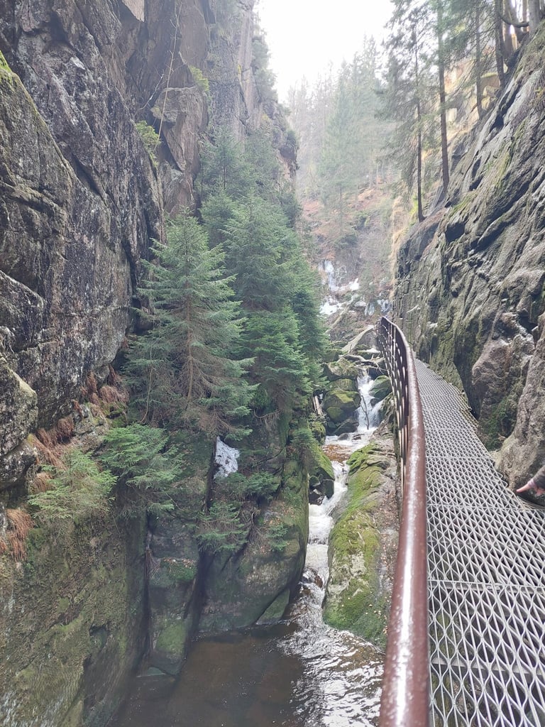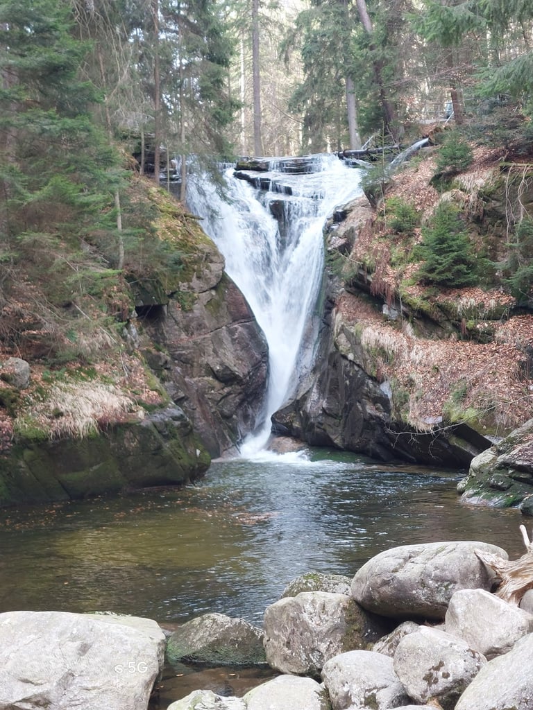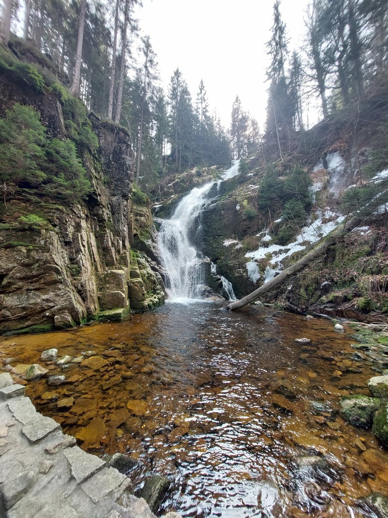 Paskui priėjome sankryžą, kur miško kelias kirtosi su Raudonuoju taku. Grįstas trinkelėmis – puiku. Tačiau tako statumas per paskutinius 100 ar 200 metrų niekais pavertė Google prognozes apie 22 minutes iki krioklio. Takas realiai labai status! Kas 10 metrų tenka stabtelėti atsikvėpti. Užtrukome gerokai ilgiau, bet galutinis rezultatas atpirko viską. Tiesa, pradžioje nelabai supratome, dėl ko čia visi taip „alpsta“. Krioklys kaip krioklys. Jau matėme ne vieną... Aplinkiniai vaizdai gal net įdomesni, nes šalia apžvalgos aikštelė į Izeros kalnus.