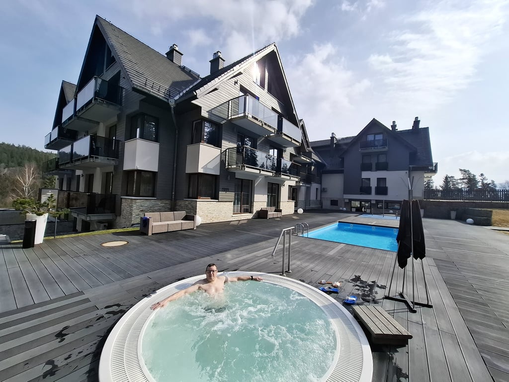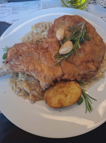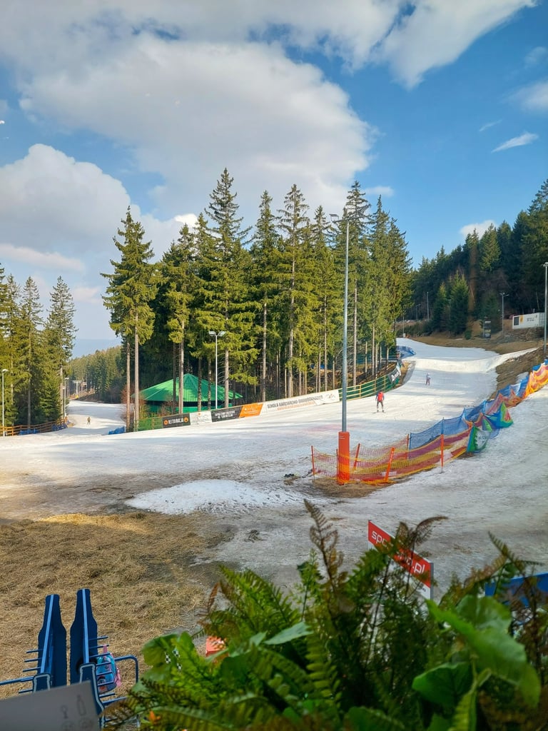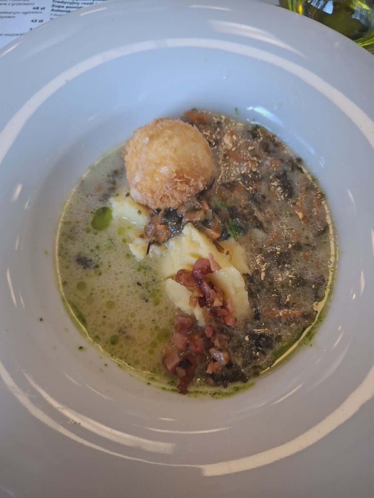 Nors 4,6 balo, bet atsiliepimai labai prieštaringi. Priėmė maloniai. Vaizdas pro langą irgi labai neprastas – tiesiai į slidinėjimo trasą. Maisto teko palaukti, nors lankytojai buvo vos keli. Kai atnešė patiekalus, jų vaizdas buvo kaip aukščiausios klasės restoranuose. Deja, tuo visi malonumai ir baigėsi. Patiekalai gražūs, bet papuošimai pagal vieną „kurpalių“ – ir sriuba, ir kepsniai, ir visa kita dekoruota žirnių ūgliais, skrudintais Kale kopūstais ir marinuotais raudonaisiais svogūnais. O skonis... Grybų sriuba (22 PLN) buvo neįsivaizduojamai rūgšti nuo tų pačių papuošimui skirtų marinuotų svogūnų, ir dar gardinta specifiniais prieskoniais (kaip patyrėme vėliau, jie naudoti absoliučiai visuose patiekaluose), kurie nužudė bet kokį grybų aromatą. Jei toks buvo – mat sriuboje dominavo perlinės kruopos. Vienintelis jos privalumas buvo, kad kiek sušildė skrandį. Balandėliai su vištiena (58 PLN) neturėjo nieko bendro su Lietuvoje ir Lenkijoje įprastais balandėliais. Suvynioti į Kalė kopūsto lapus, labai rūgštūs ir aitrūs, rūgščioje pomidorų padažo baloje. Kiek pakenčiamesnis buvo karbonadas su kaulu (66 PLN), patiektas su bulvių koše. Šviesus alus (0,5 L) 19 PLN, tamsus Kozel alus (iš butelio) 22 PLN. Iš viso už Instagraminius, bet absoliučiai neskanius pietus sumokėjome 201 PLN (48,65 Eur.). Beje, verta parašyti ir apie šio didžiulio restorano WC. Akivaizdžiai ginantis nuo slidininkų, kad jie nelakstytų į šio restorano "šventovę" už veltui, į tualetus galima patekti tik pasiėmus raktų ryšulį su didžiule skaitmenine kortele nuo baro. Ir tik tada, kai jau esi užsisakęs. Su ta kortele gali tekti ilgokai paplušėti, kol durys į WC patalpą atsivers: tiesą sakant, mums teko prašyti padavėjos pagalbos. O viduje – patalpa, kurios švara kelia rimtų abejonių.