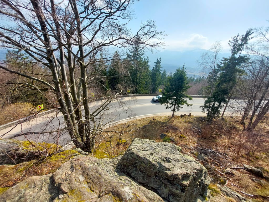Kelias nėra labai siauras, bet turi 180 laipsnių posūkį aplink uolą. Todėl rekomenduojama būti atsargiems. Greitis 40 km/h - ne šiaip sau. Kai pasninga ar palyja, ši vieta tampa spąstais neatsargiems vairuotojams. Ką byloja ir vietos pavadinimas. Bandžiau nufotografuoti posūkį nuo uolos, bet vaizdas (o ypač jausmas) ne toks kaip sėdint už vairo. Tačiau aplinkiniai vaizdai visiškai atperka pastangas užkopti ant pačios uolos.