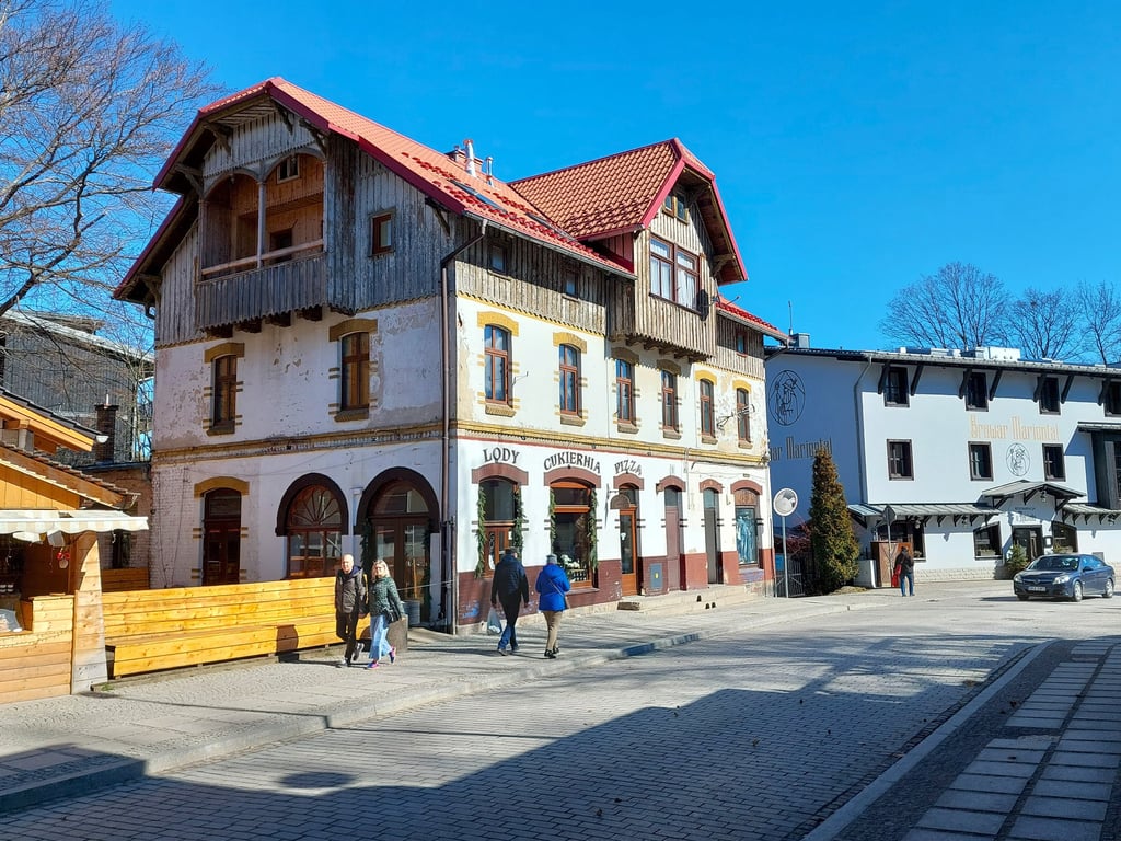 Paskutinis parkingas brangiausias, bet arčiausiai pagrindinės gatvės - 1 Maja (Gegužės 1-osios). Kaip ir bet kuriame turistiniame miestelyje, čia lauktuvėms rasite visko. Gal kiek brangiau. Pakeliui dairėmės į aplinkinius pastatus. Nenuostabu, kad miestelis labiau vokiškas, negu lenkiškas.