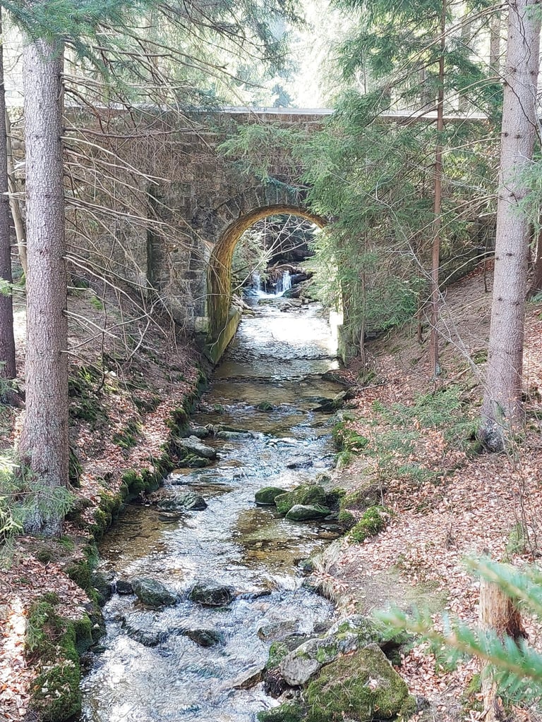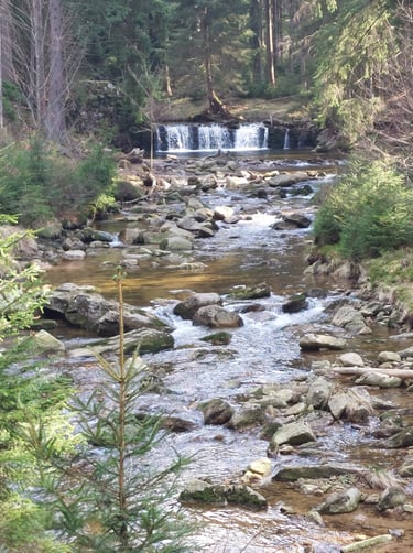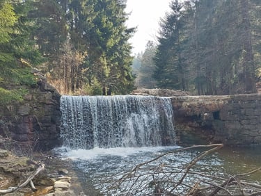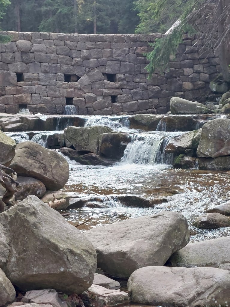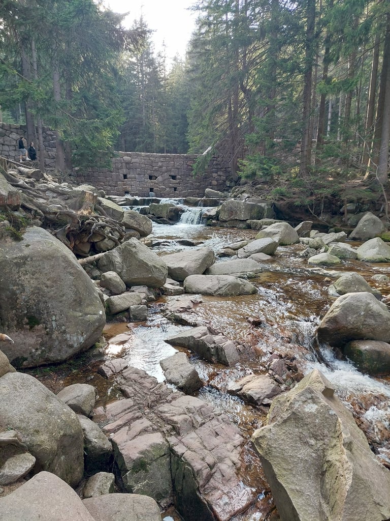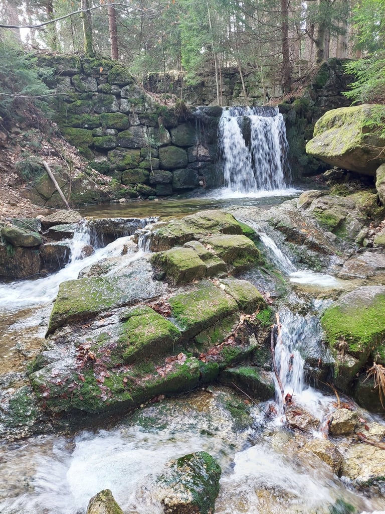 Tai dirbtinai sukurta Wodopój upelio kaskada santakoje su Kwisa upeliu. Pastatyta po didelio potvynio 1897 m. Vieta tokia žavinga, kad iki 1945 m. buvo gamtos paminklas. Nors tai ir dirbtinis XIX a. krioklys (sakyčiau, kriokliukas), bet vieta tikrai nerealiai graži! Galima palypėti akmenimis ir pamatyti upelių santaką ir patį krioklį įvairiais rakursais. Ir vėl... Nė vieno turisto! Beje, nėra net parkingo - tiesiog sustojome šalikelėje.