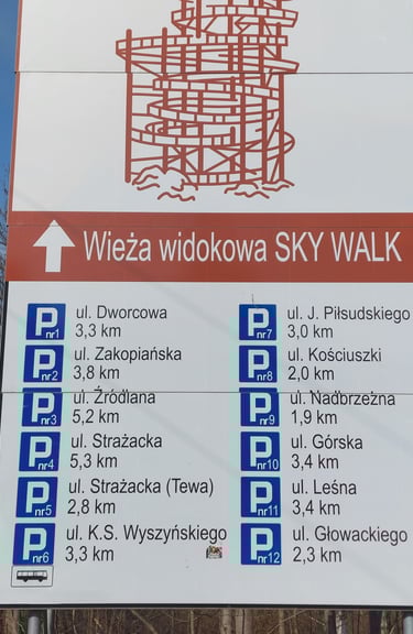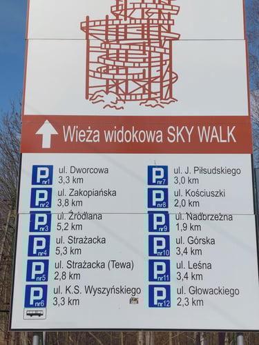 Taigi, teko ieškoti kuo artimesnio parkingo. Artimiausias yra Pamiątki pod Wieżą SKY Walk C - bliżej nie będzie! (Suvenyrai prie „SKY Walk C“ bokšto – arčiau jau nebeįmanoma!). Deja, parkinge apmokėjimas tik grynais – 30 PLN nepriklausomai nuo stovėjimo laiko. Tačiau nuo čia pakilimas - tik nepilni 70 metrų. Nuo parkingo dalis tako eina lyguma, bet paskutiniai 50 metrų - tai stati akmenuota įkalnė. Patogi avalynė labai praverstų. Tačiau pasiekus bokštą visi sunkumai pasimiršta, o statinio didingumas tiesiog užburia. Bokšto pagrindas - maždaug 630 m virš jūros lygio (aplinkiniai kalnai aukštesni, apie 1100 m). Pats bokštas 65 metrų aukščio, stiklinė apžvalgos aikštelė - 62 metrų aukštyje, tako ilgis 850 metrų. Tako pakilimas visai nestatus ir galima palengva eiti į viršų.
