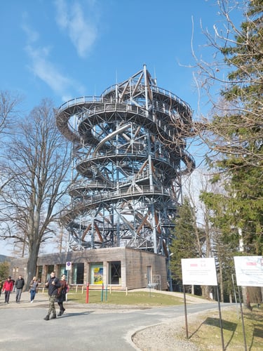 Pradžioje nedrįsau žmonai siūlyti šio objekto, nes tai aukščiausias apžvalgos bokštas Lenkijoje! O jai nelabai patinka didelis aukštis. Tačiau bokštas padarytas kaip spiralinis takas su terasinėmis lentomis ir visai nebaisus. Jeigu kažkam reikia „ekstrymo“ čia jo irgi ras. Tiesą sakant, teko laukti ne itin vėjuotos dienos, nes kartais vėjo gūsiai čia būna uraganiniai.