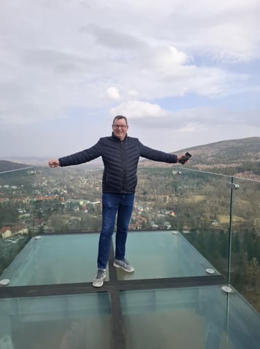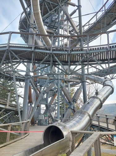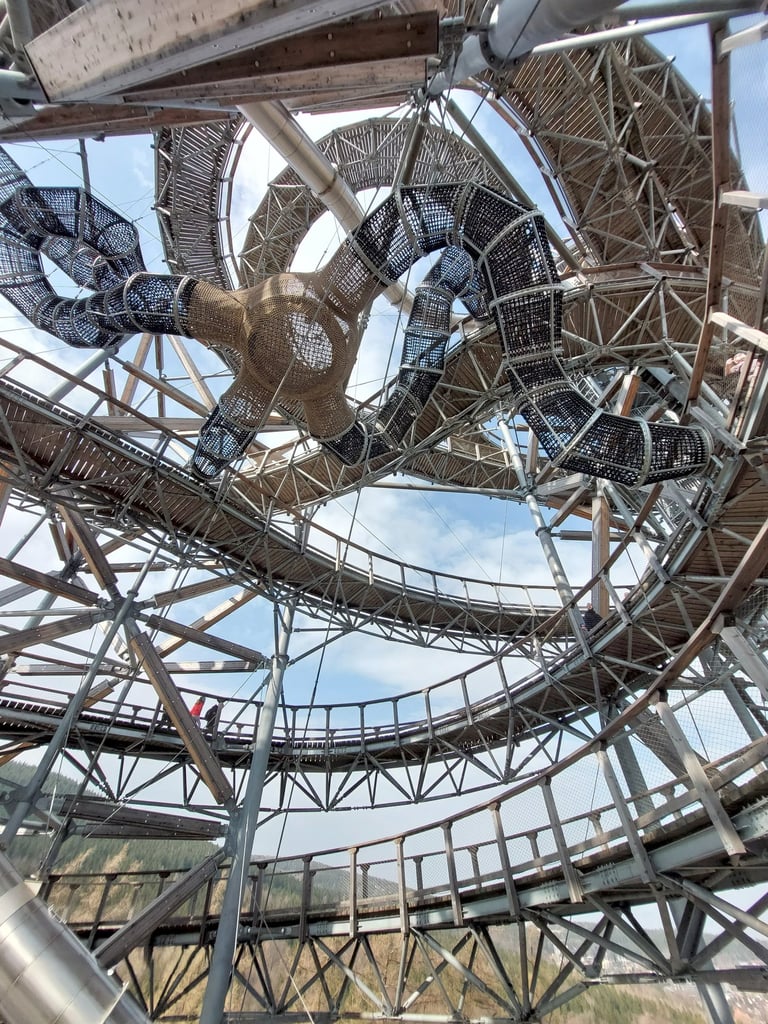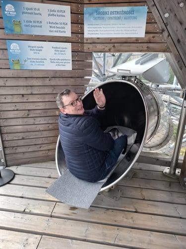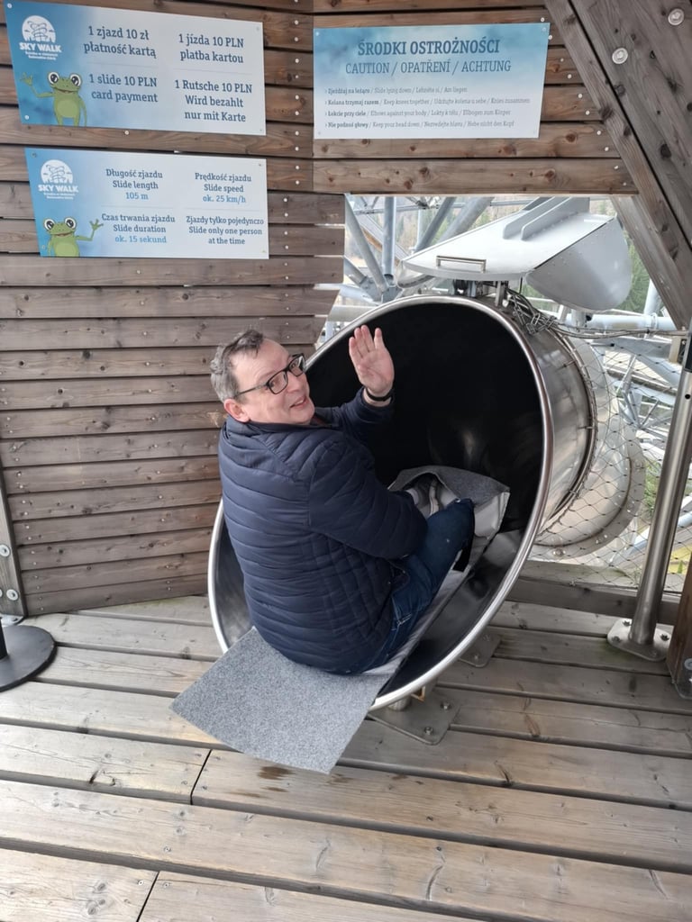 Palengva ėjome į viršų ir stebėjome „ekstrymo“ mėgėjus, kurie laipiojo virvių voratinkliais ir ašaros formos tinklu virš bedugnės, ant kurio galima vaikščioti, o galima atsigulti ir „pajusti erdvę po kojomis“. Tiesa, manęs ši perspektyva netraukė, bet ant stiklinės apžvalgos aikštelės visgi atsistojau! Tačiau pats kiečiausias dalykas bokšte - tai 105 metrų ilgio nusileidimo vamzdis iš nerūdijančio plieno! Rimtai atrodė ir aprašymas – nusileidimo laikas 15 sekundžių, išvystomas greitis iki 25 km/h! Ir labai norėjau išbandyti, ir baisoka buvo. Bet pasiryžau. Žmona durnium išvadino. 🤔 Nusileidimo kaina 10 PLN. Mokėti tik kortele. Susimokėjau. Prižiūrėtojo klausiu - ar baisu? Kam baisu, kam ne – diplomatiškai atsako. Jeigu baisu, imk odines „rogutes“. Tai kažkas tarpinio tarp rogių ir maišo. Įsėdau ir nučiuožiau žemyn... lėtai! Va tau ir „ekstrymas“. ☹️ Na, ne to norėjau. Tuoj pat užbėgau iki pat viršaus. Vėl susimoku. Klausiu - greitesnių „rogių“ turi? Imk iš vailoko. Va tada tikrai „nušvilpiau“ žemyn. 😁 Buvo labai smagu, bet nebuvo kritimo jausmo, o tiesiog greitas slydimas vamzdžiu. Visiems rekomenduoju!