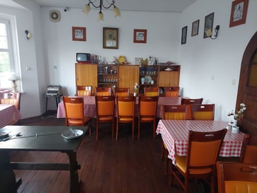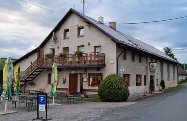 Labai jaukus ir svetingas šeimos restoranas su vietiniu maistu ir gėrimais. Nors šeimininkas angliškai praktiškai nekalba, tačiau laisvai kalba čekų, lenkų ir vokiečių kalbomis. Tai užsisakyti nebuvo problemų. Nesu čekų virtuvės gerbėjas, veikiau priešingai. Bet čia viskas buvo labai skanu. Tiek šeimininkas, tiek jo dukros be galo draugiškos. Puiku apatarnavimas, porcijos didelės, o kainos čekiškos. Polevka (sriuba) – 59 CZK (apie 2,42 Eur.), pikantni smes se žampiony (aštrus troškinys su pievagrybiais) – 149 CZK (apie 6,12 Eur.), bramboračky 4 ks (bulviniai blynai 4 vnt.) - 92 CZK (apie 3,78 Eur.), veprovy rizek, zel.obloha (kiaulienos kepsnys su žalių daržovių garnyru) - 129 CZK (apie 5,30 Eur.), hranolky (bulvytės fry) – 50 CZK (apie 2,05 Eur.), alus Krakonoš šviesus 11 0,5 L – 35 CZK (apie 1,44 Eur.), alus Krakonoš pusiautamsus 0,5 L – 40 CZK (apie 1,64 Eur.). Visi pietūs kainavo 554 CZK. Mokėjau kortele, tai pagal banko išrašą 23,24 eur. dviems. Čekams gana brangi vieta, bet ne mums. Puiki vieta. Labai rekomenduoju. Tik kažkodėl niekas nenufotografavo patiekalų - labai jau alkani buvome. 😋