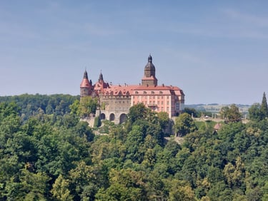 Pilis yra netoli Valbžycho, dažnai keitė šeimininkus, priklausė įvairioms valstybėms, buvo ne kartą sugriauta per įvairius karus. Nuo IX iki XX a. pilis tapo vienų turtingiausių vokiečių aristokratų von Hochbergų rezidencija. Didikai rūmuose įvedė daug naujovių. Buvo įrengti modernūs keliai, sutvarkytas parkas ir net miškas; įsteigta nemokama kulinarijos mokykla Valbžycho kasyklose dirbančių darbininkų dukterims; jauniems darbininkams organizuotos vakarinės pamokos; remtos įvairios religinės bendruomenės, įsteigti laidojimo, ligoninės, našlių, pensijų ir išėjimo į pensiją fondai. XIX amžiaus pabaigoje šeima kasmetinei socialinei paramai išleisdavo 60 000 markių! Todėl nenuostabu kad von Hochbergai buvo labai gerbiami ir mylimi visų apylinkės gyventojų.