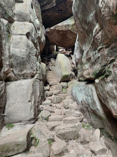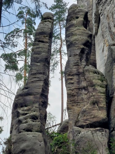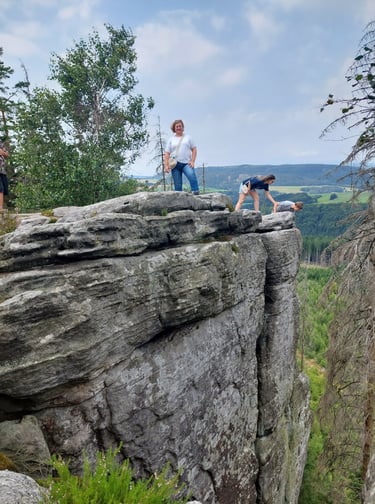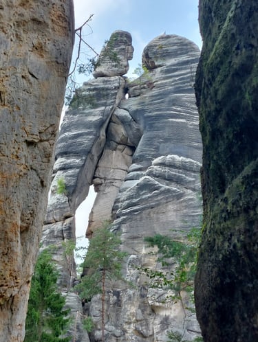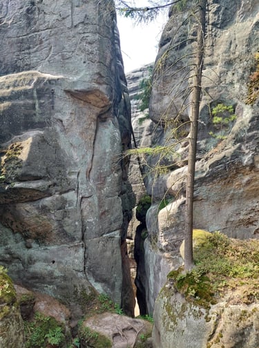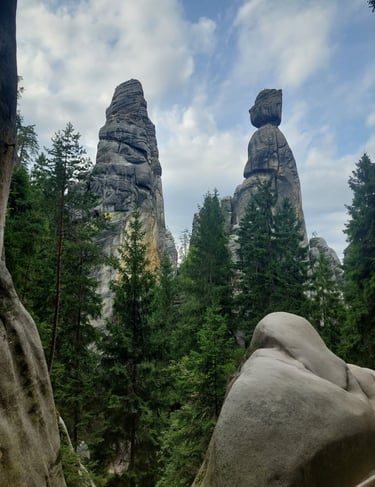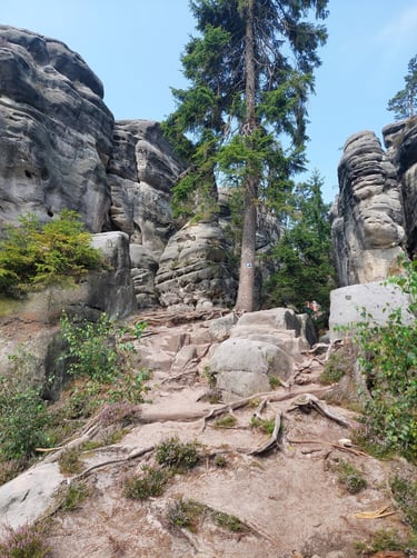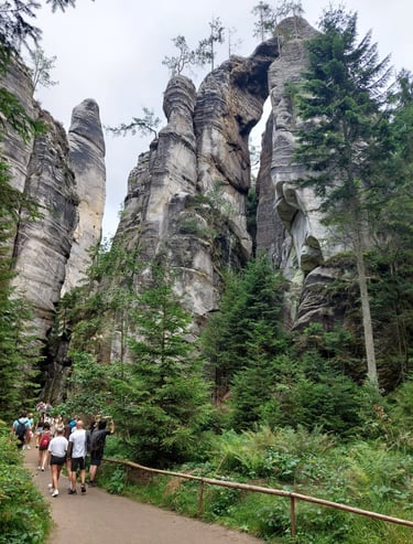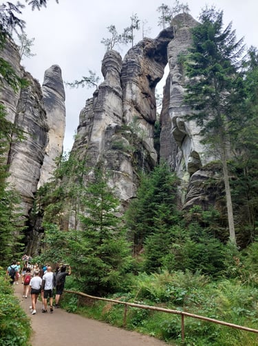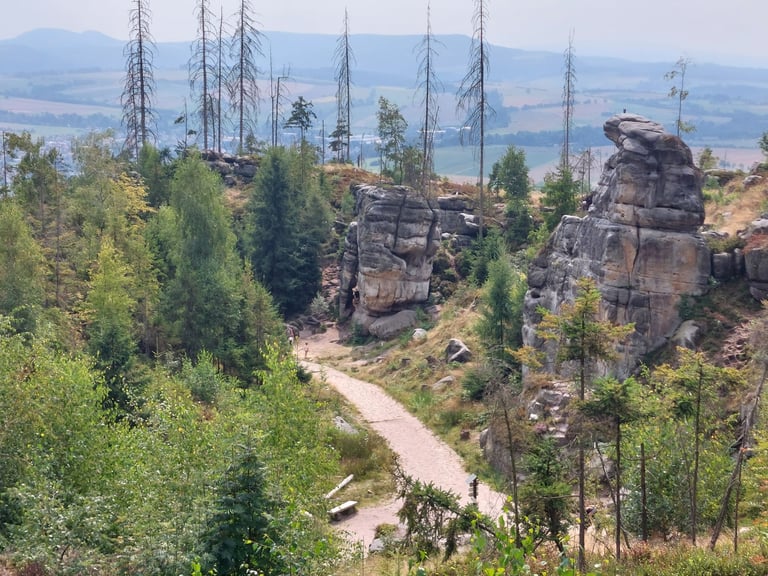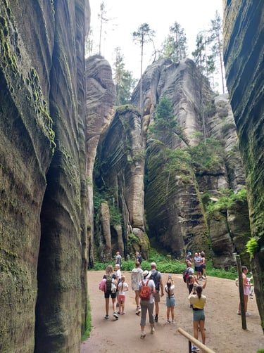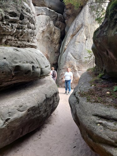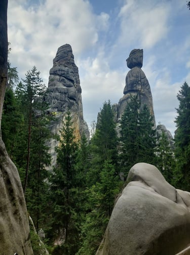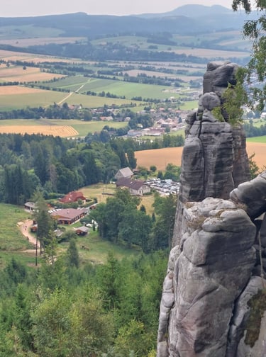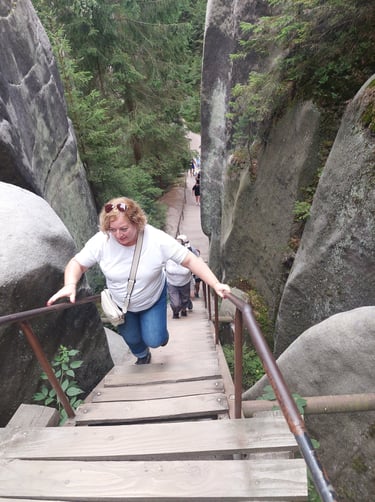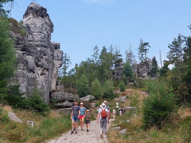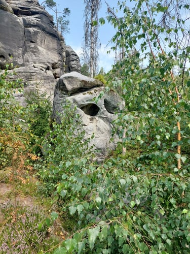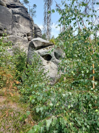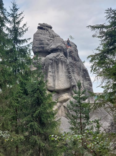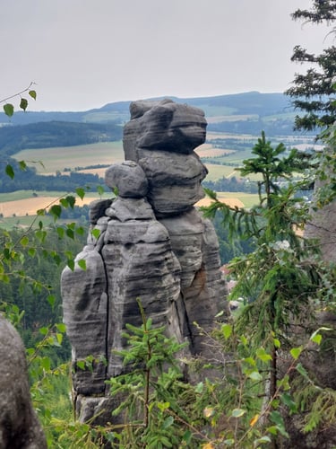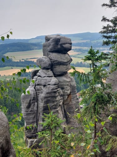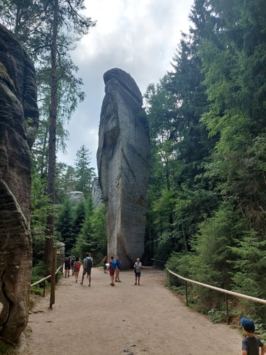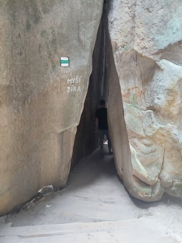 Šiek tiek painiavos buvo maršruto pradžioje – lipti per uolos viršų ar lįsti pro apačią, apeiti iš kairės ar dešinės, pabandyti įkopti arba pralįsti siauru tarpeliu. Tačiau tame ir yra akmenų labirinto smagumai, laipioti gali ir suaugę, ir vaikai. Net ir tie kurie sakė, kad neįveiks - dėl aukščio baimės ar dusulio - nesunkiai įkopė į viršūnę. Aukštis 700 m virš jūros lygio nėra labai didelis, o uolos įspūdingos. Daugelis jų turi vardus, deja jie parašyti čekų kalba. Uolos dažnai primena gyvūnus ar šiaip kažkokius padarus. Priklauso nuo fantazijos. 😊 Užkopus į viršų belieka eiti taku palei uolyno kraštą ir grožėtis aplinkiniais vaizdais.