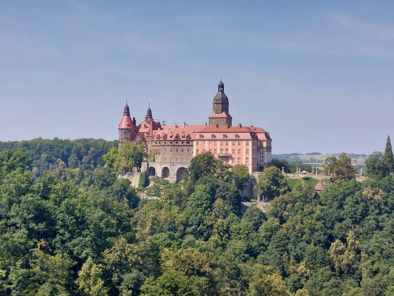 Pasistatėme automobilį pastarajame parkinge. Kaina 30 PLN dienai (apie 7,20 Eur.). Gal nuo jo eiti kiek toliau, bet galima apžiūrėti parką ir pakeliui užsukti į apžvalgos aikštelę „Punkt Widokowy na Zamek Książ“, iš kurios atsiveria pati įspūdingiausia pilies panorama. Pirmoji nuotrauka iš ten ir padaryta.