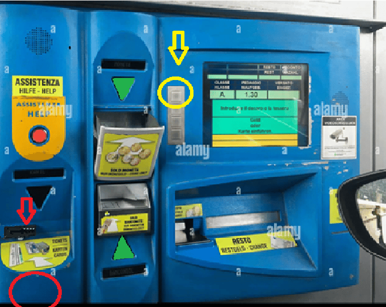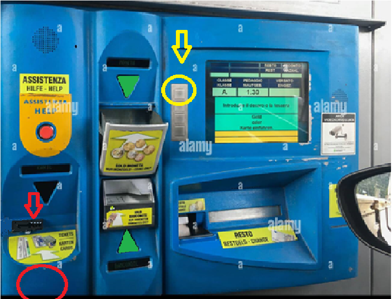 3. Įkišus bilietą aparatas duoda komandas, ką daryti toliau. Deja, tik itališkai. Jeigu kalbos nesuprantate, tiesiog atlikite sekančius veiksmus.